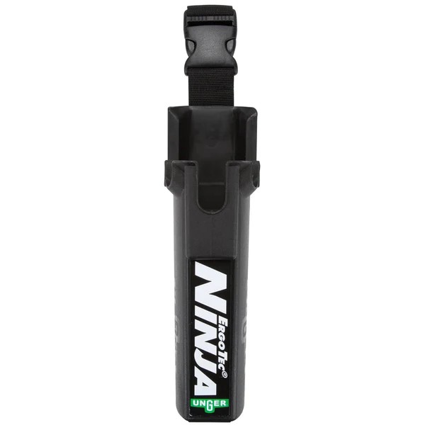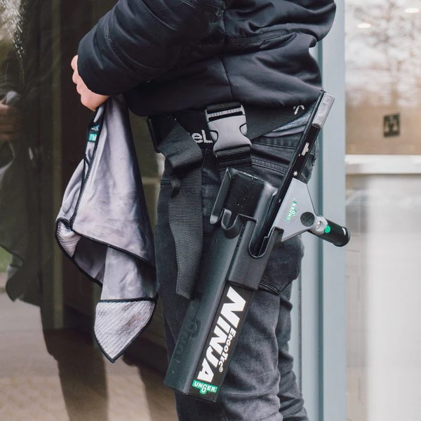 Unger ErgoTec Ninja holster for traditional tools. This ‘bucket on a belt’ comfortably holds 2 squeegees and 1 washer, with a small pocket scraper department on the front., and features a quick-release buckle to add/remove it from your toolbelt.