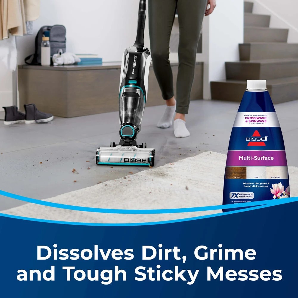 BISSELL Multi-Surface Formula is engineered to work with our innovative CrossWave and SpinWave machines. It also works in our JetScrub Pet Carpet Cleaner. This powerful formula removes messes like tracked in dirt, grime, mud, and other tough messes from sealed hardwood, ceramic, tile, linoleum, and other hard floors while also refreshing area rugs. And all it leaves behind is a fresh, spring breeze scent and virtually streak-free floors! Plus, it’s safe to use around kids and pets when used as directed, since it doesn’t have any heavy metals, phosphates, or dyes. And this formula doesn’t just clean up after pets, it helps save them, too. BISSELL proudly supports BISSELL Pet Foundation and its mission to help save homeless pets. When you buy a BISSELL product, you help save pets, too. We’re proud to design products that help make pet messes, odors and pet homelessness disappear.